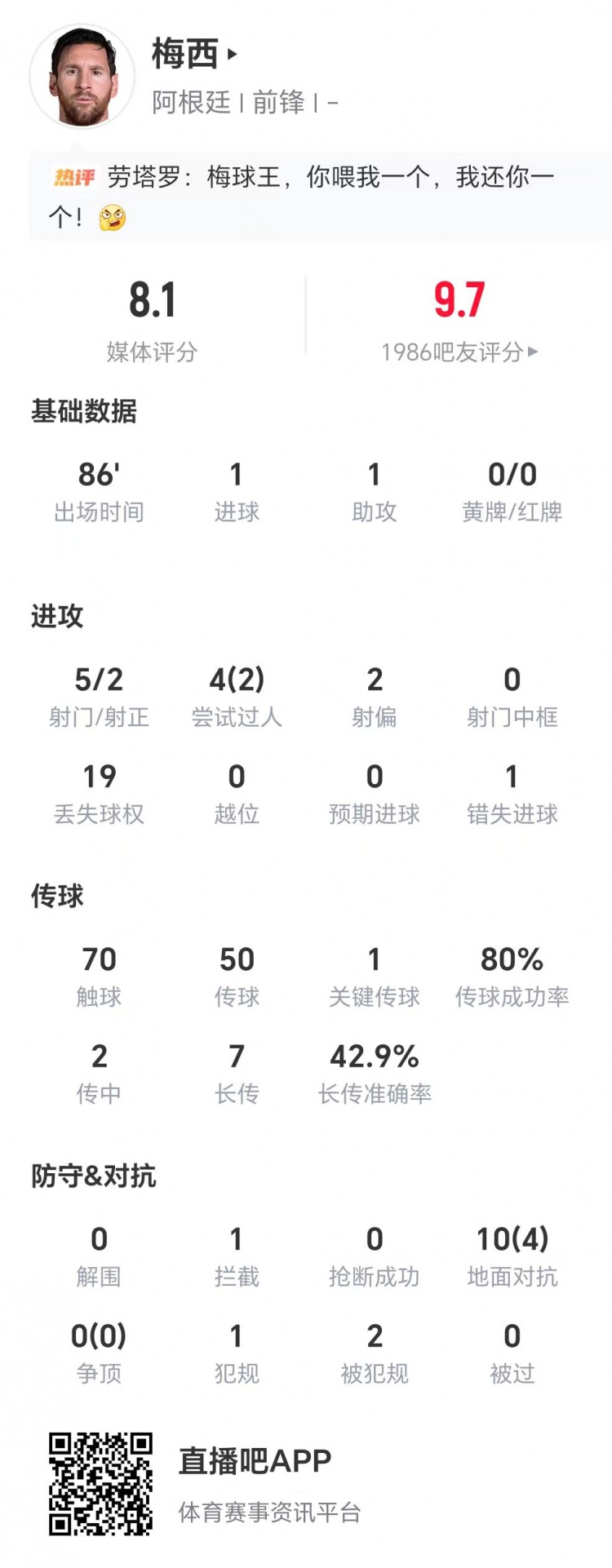 技术统计数据显示,梅西本场比赛5射两正,打进1球并送出1次助攻,4次过人两次成功,1次关键传球,10次地面对抗成功4次,获评8.1分。
