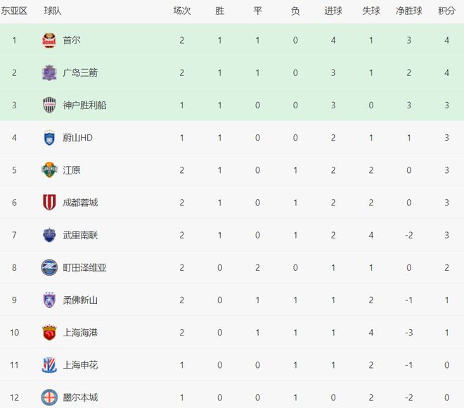 在积分榜上,首尔4分排名第1。广岛三箭也是4分。有5支球队都是3个积分,包括成都蓉城。成都蓉城排名第6。而上海海港2轮只拿到1分,排名倒数第3名。上海申花只踢了1轮,0个积分,排名倒数第2。而墨尔本城也是0分,排名倒数第1。