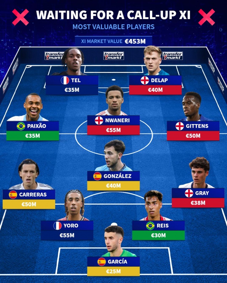 无缘国家队身价最高阵容(总价4.53亿欧,指从未入选国家队)