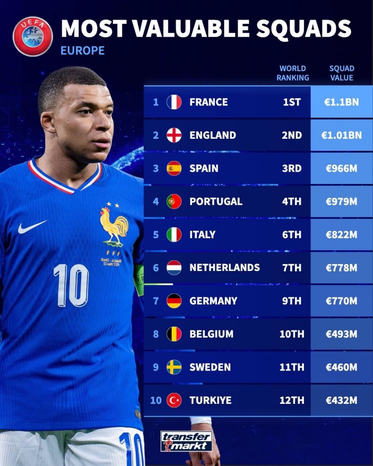 德转欧洲国家队身价榜:法国11亿欧第一,英格兰10.1亿欧第二