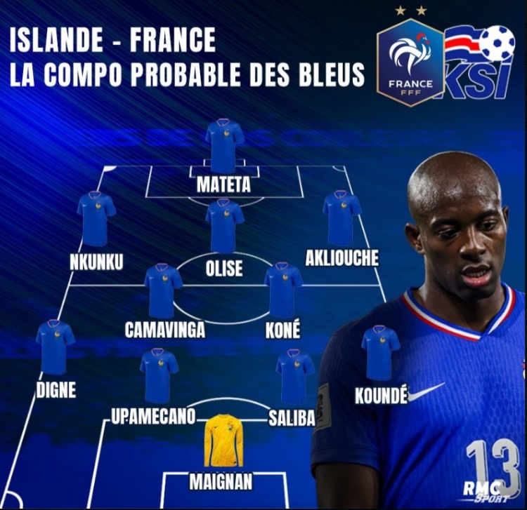 10月13日讯 北京时间周二凌晨的世预赛欧洲区小组赛,法国将前往客场挑战冰岛。RMC对本场比赛的首发阵容进行预测,马特塔首发,于帕梅卡诺和萨利巴搭档中卫。